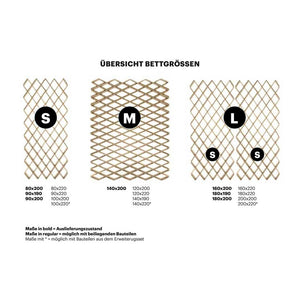 Die Grösse des Bettgestells kann jederzeit an deine Bedürfnisse angepasst werden. So kannst du es mit einem oder sogar mehreren Small-Betten verbinden oder durch die Verwendung von Erweiterungssets vergrössern. In der Anleitung siehst du, wie du deine individuelle Wunschbettgrösse erreichst.