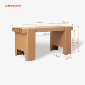 Dank der Verwendung hochwertiger Wellpappe ist der GRID Tisch nicht nur stabil, sondern auch umweltfreundlich und recycelbar. Wellpappe besteht zu einem hohen Anteil aus recyceltem Material (54 % bis 80 %) und kann vollständig über die Altpapiertonne recycelt werden. Die Papierbahnen werden mit natürlichen Klebstoffen aus Maisstärke verbunden und für die schwarze Variante mit lösungsmittelfreien Farben veredelt. Die durchdachte Lattenkonstruktion ermöglicht es dem GRID Tisch, hohen Belastungen standzuhalten. So erfüllt er die Normen DIN EN 12521:2015 und DIN EN 1730:2012 und ist dennoch leicht und einfach zu bewegen. Welchen Prüfungen der GRID Tisch standhalten musste, kannst du hier nachlesen.