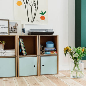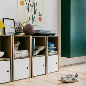 Einfach mal die Tür zu machen und dahinter alles verstecken, was nicht im Fokus sein oder vor Staub geschützt werden soll. Diese Möglichkeit hast du mit der Regaltür, die sich ganz einfach und ohne Werkzeug in das Grundmodul einsetzen und auch wieder entfernen lässt.