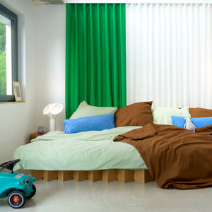 Unsere nachhaltige Naturlatex-Matratze passt perfekt zum Pappbett. Aber auch alle anderen Matratzentypen (außer Futons) sind geeignet, solange sie mindestens 15 cm hoch sind und einen mittelfesten bis festen Härtegrad haben. Bitte beachte die Empfehlungen des Herstellers deiner Matratze. In unserem Shop findest du außerdem ein nachhaltiges Bettkopfteil aus Naturlatex und Bettwäsche aus Bio-Baumwolle.