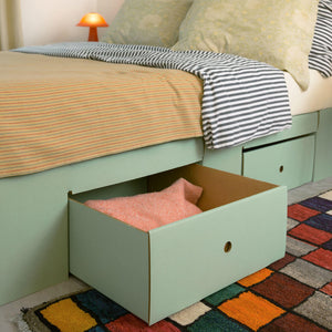 Wie das Bett, bestehen auch die Schubladen aus hochwertigster Schwerlastpappe - ein aufgrund des hohen Recylinganteils (54-80 %) und der vollständigen Recyclingfähigkeit besonders ressourcenschonendes und ökologisch nachhaltiges Material. Die hohe Qualität der Pappe sorgt für Stabilität und macht die Möbel gleichzeitig langlebig