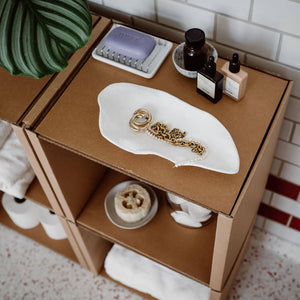 Das Regal wird auch unserer besonderen AVANA Schwerlastpappe gefertigt, die für seine Langlebigkeit und Stabilität sorgt. Sie besteht zu 54 % bis 80 % aus recycelten Papierfasern, wird mit veganem Kleber auf Maisstärkebasis verklebt und für unsere farbigen Produktvarianten mit wasserbasierter Farbe veredelt. Als 100 % recycelbares Material ist sie besonders nachhaltig.