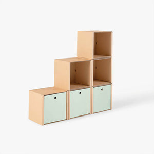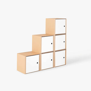 Das kleine Stufenregal eignet sich nicht nur für Dachschrägen. Auf den einzelnen Stufen kannst du Pflanzen und Lieblingsstücke platzieren. Für alles, was nicht im Fokus stehen soll, stehen dir Schubladen und Regaltüren zur Verfügung, die du ganz einfach einsetzen und auch schnell wieder entfernen kannst. Natürlich kannst du dir dein individuelles Regal auch aus beliebig vielen Grundmodulen selbst zusammen stellen. Bis zu sechs Module können vertikal und unendlich viele Module horizontal verbunden werden.